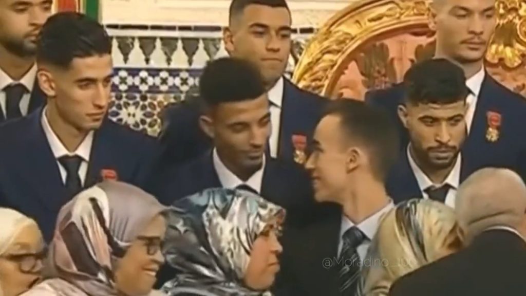 تداول رواد مواقع التواصل الاجتماعي لقطة طريفة بين ولي العهد مولاي الحسن واللاعب عز الدين أوناحي على هامش حفل استقبال أعضاء المنتخب الوطني المغربي من طرف الملك محمد السادس أثناء عودتهم من المشاركة في نهائيات كأس العالم قطر 2022.