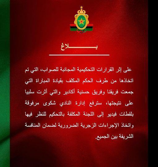 على إثر القرارات التحكيمية المجانبة للصواب، التي تم اتخاذها من طرف الحكم المكلف بقيادة المباراة التي جمعت فريقنا وفريق حسنية أكادير والتي أثرت سلبيا على نتيجتها، سترفع إدارة النادي شكوى مرفوقة بلقطات فيديو إلى اللجنة المكلفة بالتحكيم للنظر فيها واتخاذ الإجراءات الزجرية الضرورية لضمان المنافسة الشريفة بين الجميع.