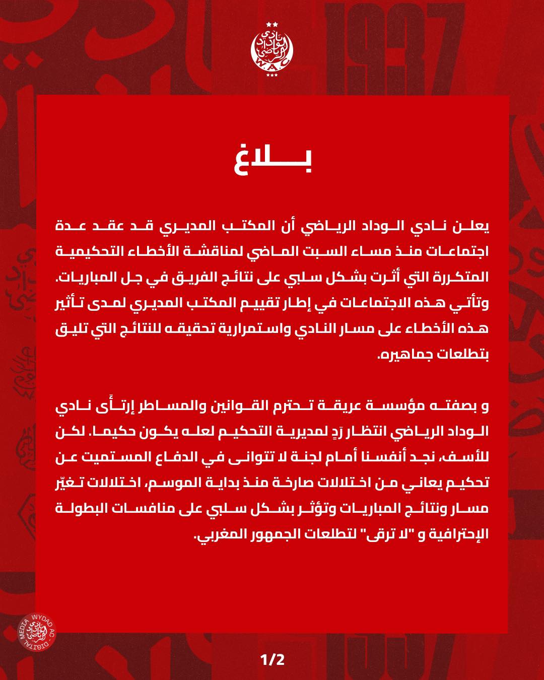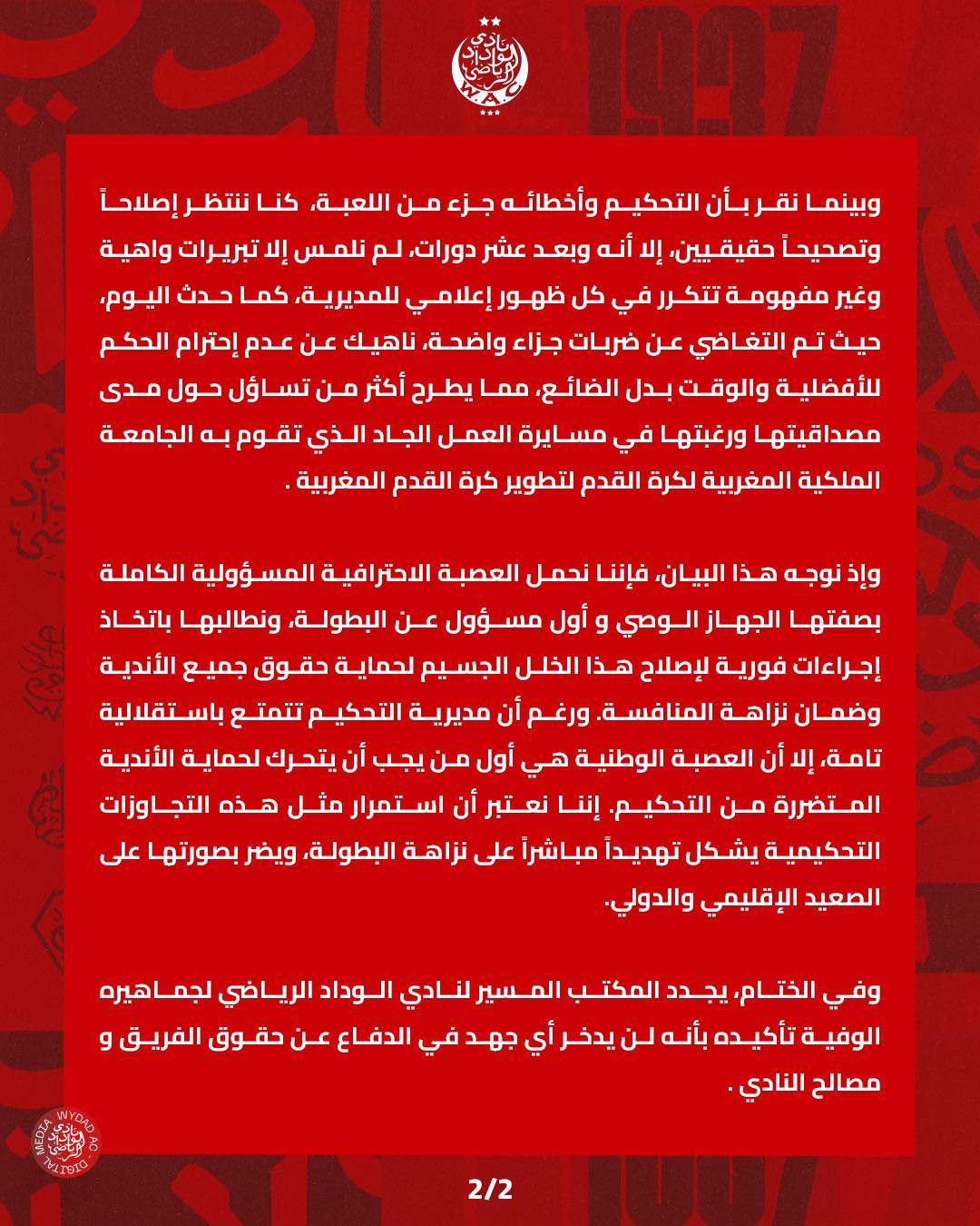 وأضاف الوداد في بلاغه أنه رغم الانتظار لأكثر من عشر دورات، لم يلمس أي إصلاح حقيقي، بل تم تكرار تبريرات غير مفهومة في كل ظهور إعلامي للمديرية، ما يطرح علامات استفهام حول مصداقية عملها ورغبتها في تحسين جودة التحكيم في البطولة.