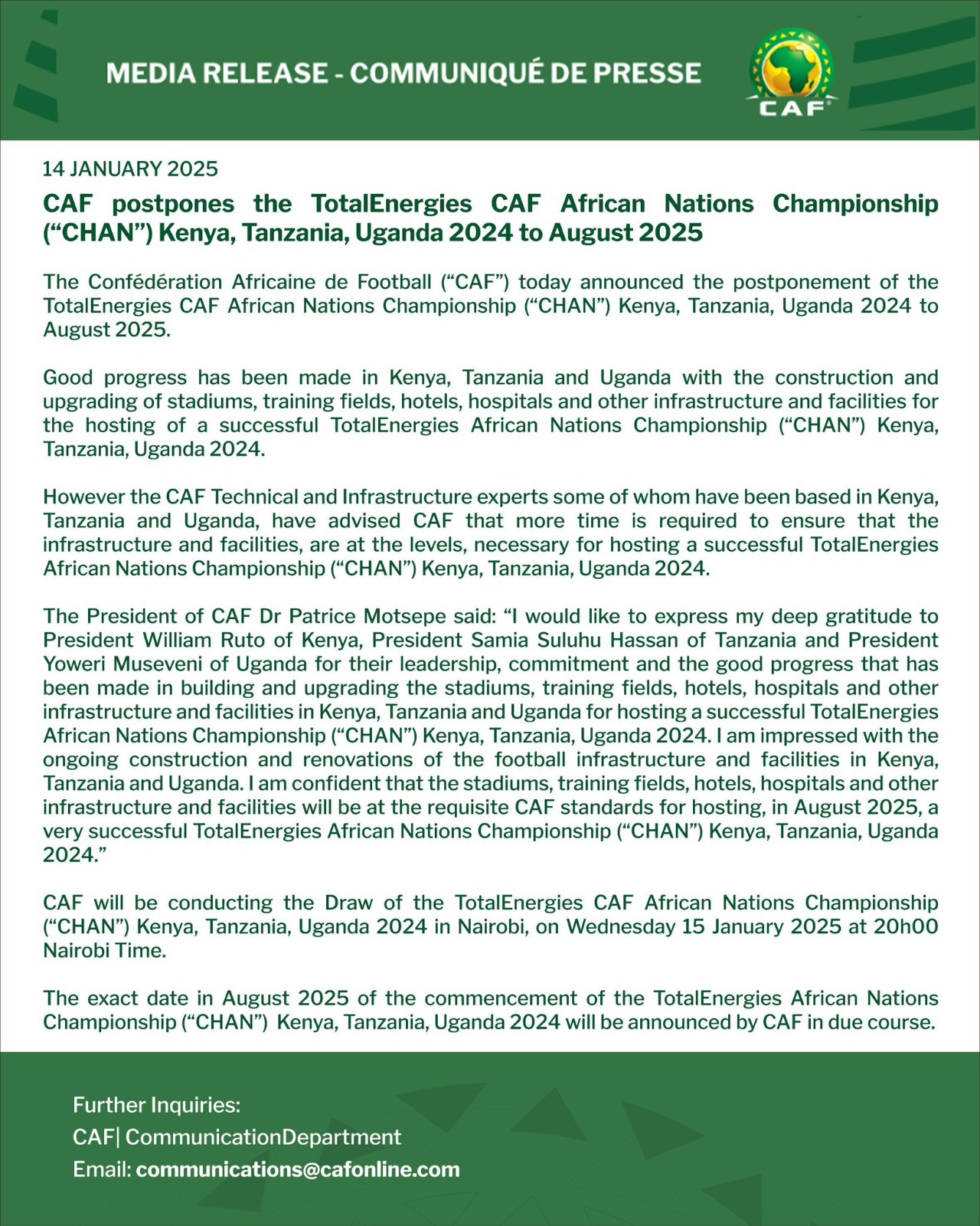 أعلن الاتحاد الأفريقي لكرة القدم (الكاف)، اليوم الثلاثاء، تأجيل بطولة كأس أفريقيا للمحليين (الشان) 2024، التي كانت مقررة في كينيا وتنزانيا وأوغندا، إلى شهر غشت 2025.