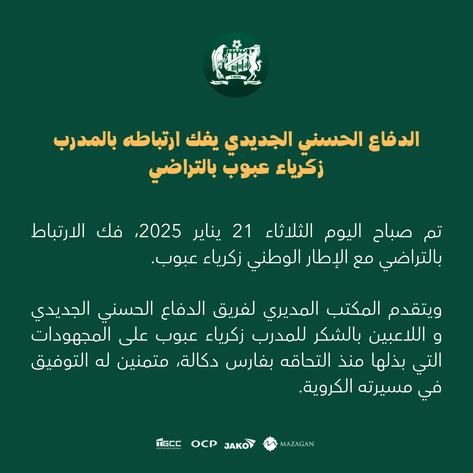 أعلن نادي الدفاع الحسني الجديدي، اليوم الثلاثاء، عن فسخ عقده مع المدرب زكرياء عبوب بالتراضي، وفق ما أكده الفريق في بيان رسمي.